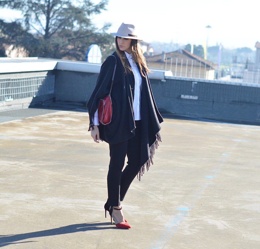 Ecco così che, in queste foto, ho scelto di abbinare una camicia bianca basica ad un maxi mantella.