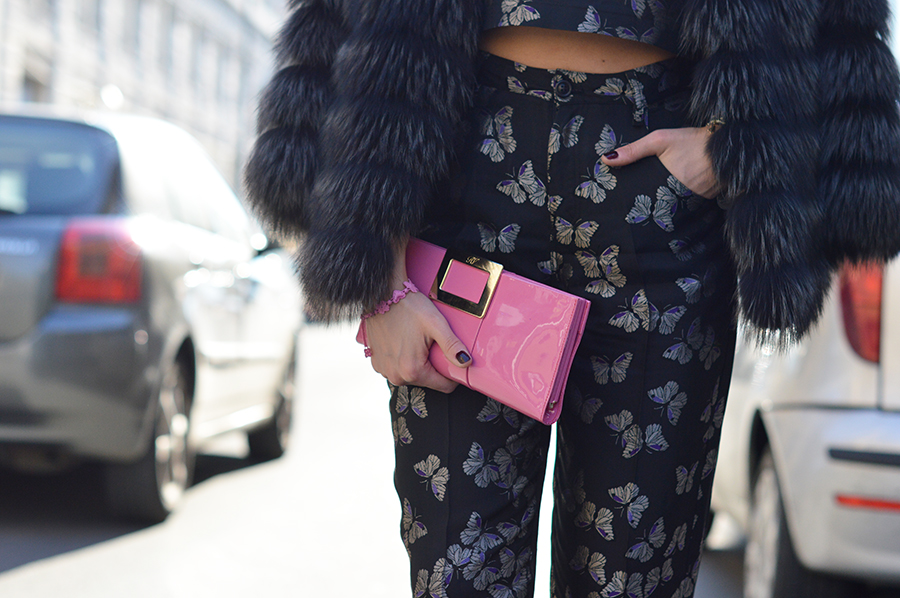 Starts the recap of the fashion week just ended, here’s the look I wore on Saturday to see the Au Jour Le Jour, Ermanno Scervino and Roberto Cavalli shows: crop top and high-waisted pants by Giuliette Brown, pink baguette and Rockstud by Valentino. Giuliette Brown, it’ s a new brand of a dear friend and blogger, which has dressed me for this fashion week, giving me the opportunity to wearing a preview some must pieces of her wonderful collection.