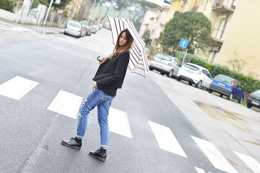 Da quando sono rientrata da Stoccolma, non ha smesso di piovere neanche un secondo. Ne ho approfittato per sbrigare alcune importanti commissioni e mi sono riposata un pò, ma dopo il secondo giorno, questa pioggia mi aveva già stancata. Oggi quindi, foto sotto l’ ombrello, con un look un pò improvvisato. Indossavo la giacca di Zara Studio, uno dei tanti acquisti che ho fatto ai saldi, e le stringate di Dr. Martens, un vero must!!
